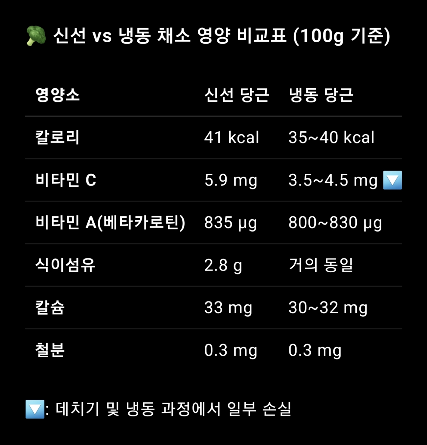 🥦 신선 vs 냉동 당근 영양 비교표 (100g 기준)