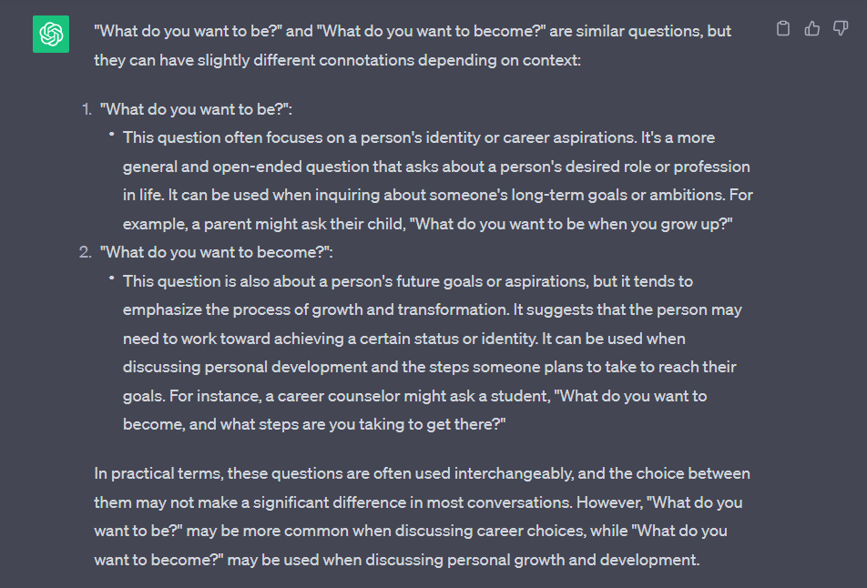 In summary, "be" typically describes a state or condition as it is at a specific moment, while "become" describes the process of changing from one state to another over time. "Be" is often used for static descriptions, while "become" is used for dynamic, evolving situations or ambitions.