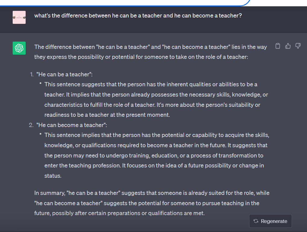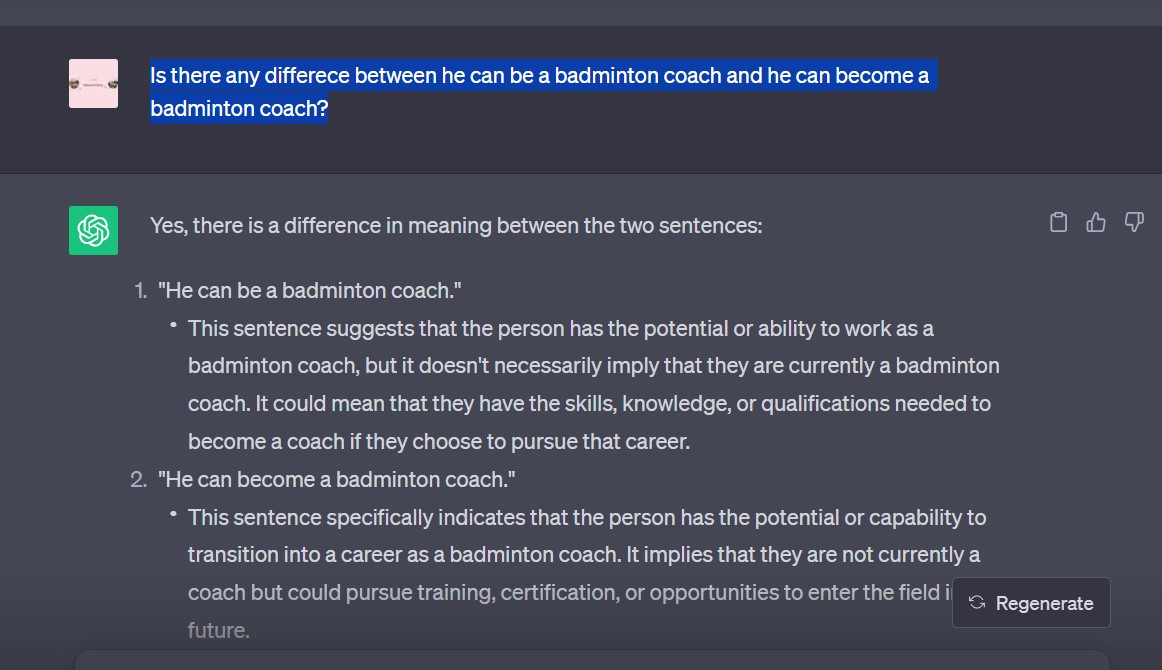 배드민턴 코치가 되고 싶어서 방과 후 열심히 연습한다. 라는 배경설명 없이 곧바로 He can be a badminton coach와 He can become a badminton coach 차이점이 무엇이냐고 물었을 때 chatgpt는 아래와 같이 답변하였다.